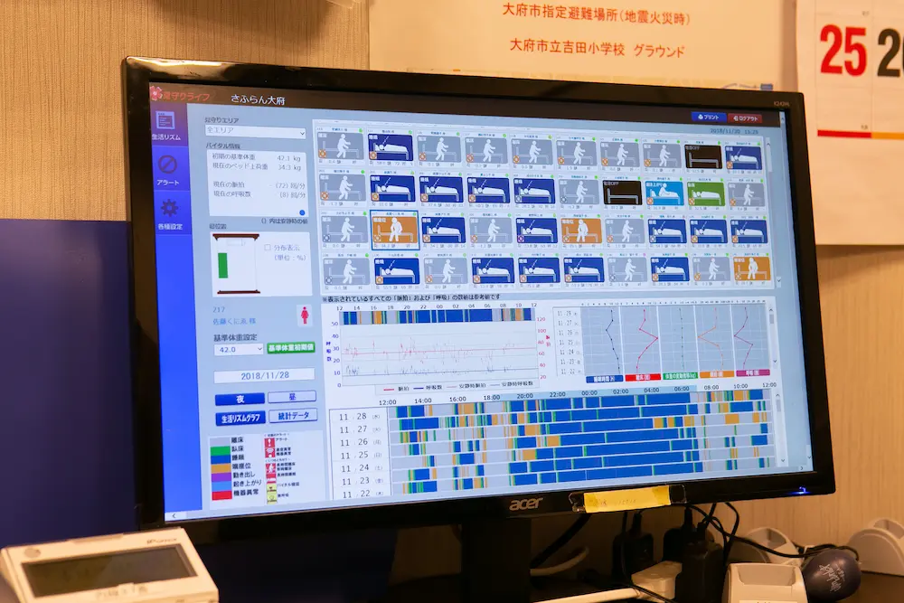 見守りライフは、フロアステーションのパソコンモニター1台で、フロア内すべての利用者の状態を把握することができます。 そのため、職員は他の業務を行いながらでも見守りを継続することが可能になりました。 さらに、利用者それぞれの生活リズムや行動パターンが把握できるようになり、導入後は一人ひとりにとって適切なタイミングで職員が訪室できるようになりました。