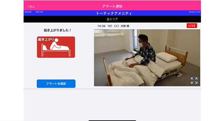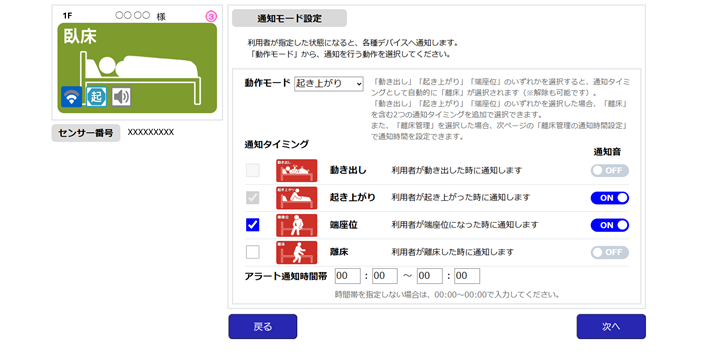 ベッド上の動きを検知し、「動き出し」「起き上がり」「端座位」「離床」などの通知タイミングを自由に設定可能。 誤報が少なく、必要なタイミングで迅速に対応できるため、事故のリスクを大幅に低減します。